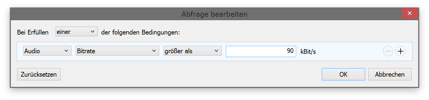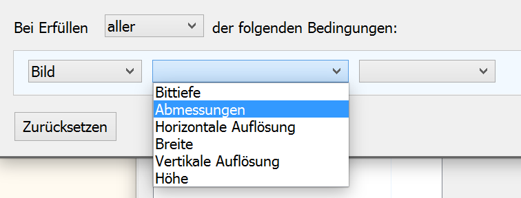 In einem Dateifilter können erweiterte Dateieigenschaften (z.B. Bildgröße, Bitrate, Aufnahmedatum) verwendet werden.