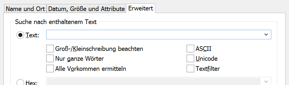Die Suche nach verschiedenen Textformaten (ANSI, ASCII, Unicode) erfolgt in einem einzelnen Suchvorgang. Textdateien im UTF-8 Format werden ebenfalls unterstützt.